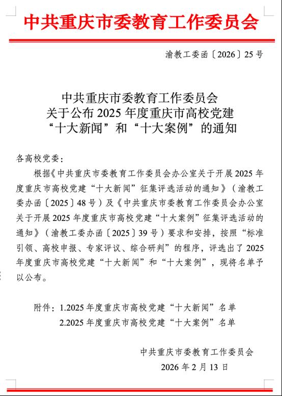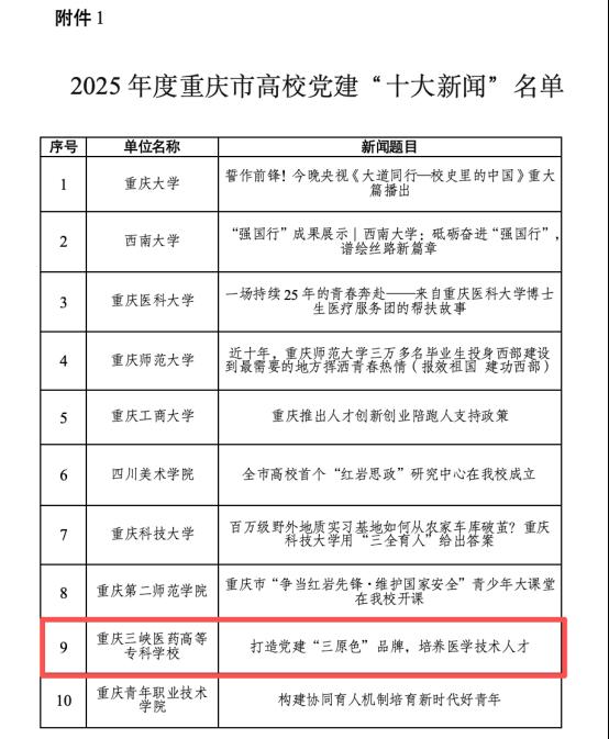 近日,重庆市委教育工作委员会公布2025年度重庆市高校党建“十大新闻”评选结果,我校医学技术学院《打造党建“三原色”品牌,培养医学技术人才》的典型经验与显著成效荣耀上榜。此次入选,既是对我校基层党建工作创新实践的高度认可,也是我校坚持以高质量党建引领高质量办学治校的又一标志性成果。