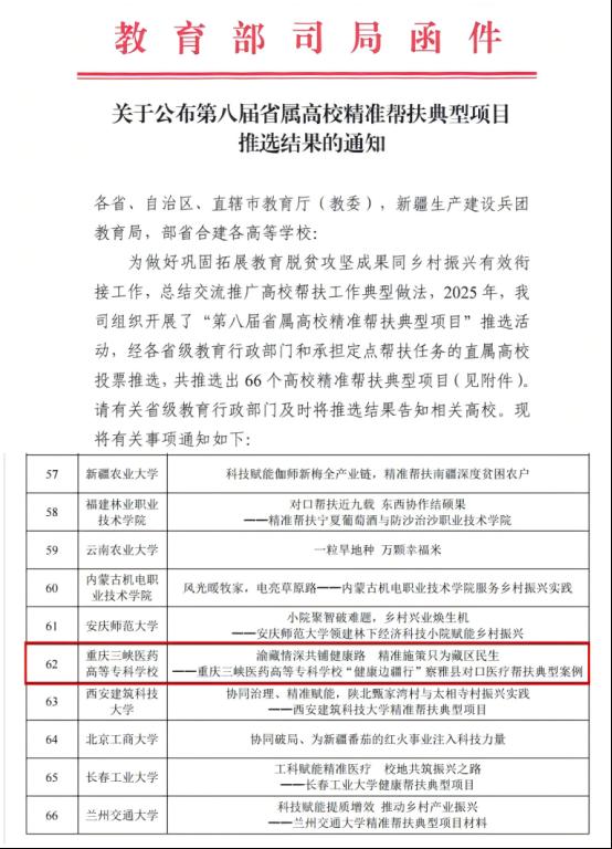 此次入选,是教育部对我校多年来坚守医药高校使命、深耕精准帮扶、助力乡村振兴的高度认可,也是学校立足三峡、服务基层、辐射西部办学定位的生动实践。
