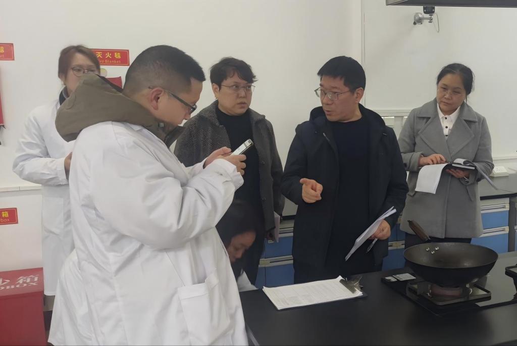 检查组深入药学院中药炮制实验室、医学技术学院实训室、实训中心试剂暂存区、科技大楼危化品库房、配电房、学生食堂、学生宿舍、教学楼等重点区域,采取“拉网式”“地毯式”方式开展全面排查。检查聚焦实验实训安全管理,重点查看了实验设备运行、操作规范、消防设施配备及安全管理制度落实情况;围绕危化品存储、使用、处置全流程,详细核验了分类存放、专人管理、标签标识、台账登记及双人双锁管理等关键环节,并对应急预案制定与演练情况进行抽查;针对校园基础设施安全,仔细检查了配电房电力设备运行状态、绝缘防护措施及日常巡检记录,对第三教学楼外墙砖脱落隐患点进行现场查看,详细了解日常巡查、警示标识设置及维修推进情况;在食品安全方面,全面检查了学生食堂食品加工操作流程、餐具消毒、燃气使用及后厨环境卫生,要求严把食品安全每一道关口。