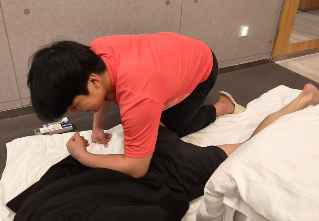 在持续数日的赛事保障中,该团队展现出过硬的职业素养。他们运用专业按摩、肌筋膜松解等技术,为考生提供个性化运动康复服务。考前实施精准的肌肉放松与关节活动度优化,配合肌内效贴扎与运动绷带固定技术,为关节提供稳定支撑、拉伸肌肉,帮助考生更好地舒展身体,同时预防运动损伤;赛后针对身体酸痛与疲劳感开展深度舒缓,及时处理扭伤等不适,加速恢复。团队还针对不同项目特点制定差异化恢复方案,累计服务考生120余人,切实守护运动安全与竞技状态。