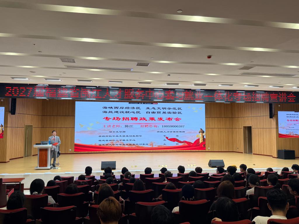 为深入推进实习就业一体化建设,强化校地协同育人实效,4月8日—10日,福建省闽江人才服务中心陈江主任一行到我校开展实习就业一体化专场招聘会。学校高度重视、精心组织,分学院举办3场专场宣讲会、2场集中面试签约会,累计700余名学生参会,现场达成签约意向60余人。