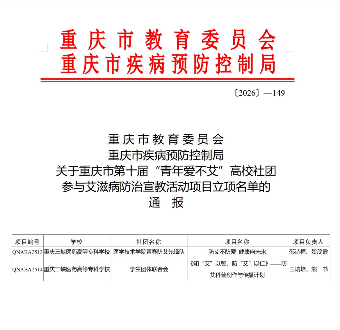 近日,重庆市教育委员会、重庆市疾病预防控制局联合公布第十届“青年爱不艾”高校社团防艾宣教活动立项结果。本次全市共有91个项目参与申报角逐,最终55个项目获批立项,我校申报的《防艾不防爱˙健康向未来》和《知“艾”以智,防“艾”以仁——防艾科普创作与传播计划》项目双双入选,彰显了我校共青团深化社团规范化建设、提升育人质量的扎实成效。