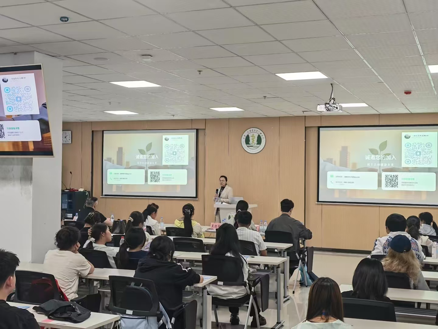 我校作为西部地区医药卫生类高校,多年来始终坚持服务国家战略、服务西部建设,积极引导毕业生建功边疆、扎根基层医疗卫生事业发展。新疆第八师石河子市团场医院多年以来多次到校宣讲,既为同学们送来了优质就业岗位,也为我校毕业生服务西部、践行医者初心搭建了重要桥梁。宣讲会上,4家团场医院代表先后登台,围绕医院的发展历程、特色科室、未来建设规划等进行了介绍,并详细解读了医院的岗位需求、任职要求,面试安排等内容。最后,他们就同学们普遍关心的职业发展路径、福利待遇保障等问题,如给予耐心细致的解答,现场气氛活跃。