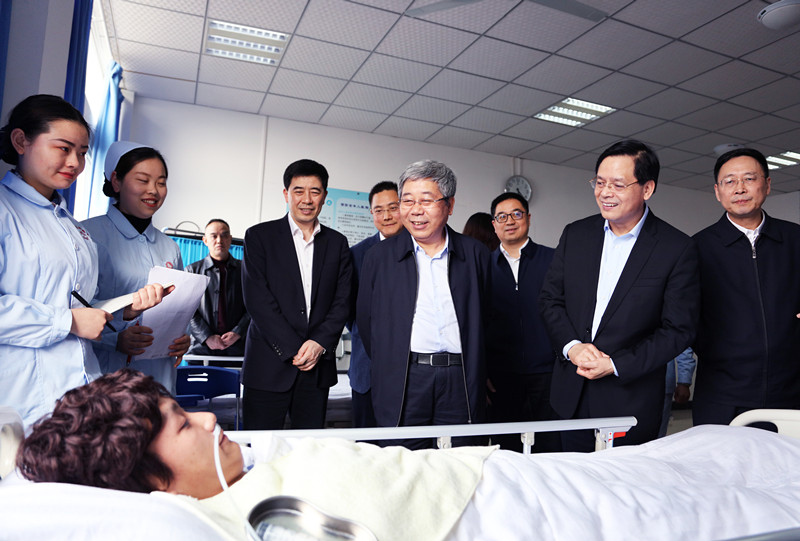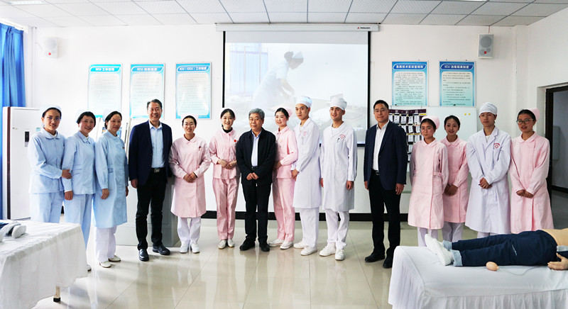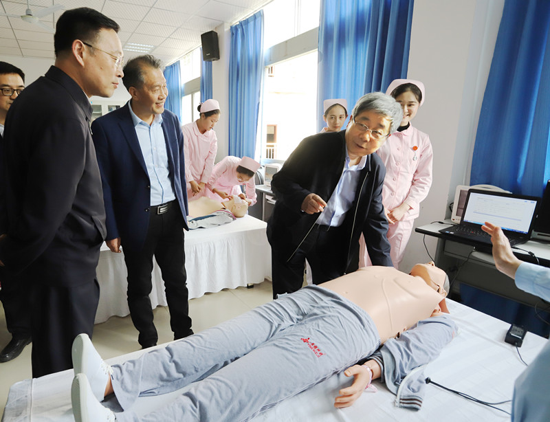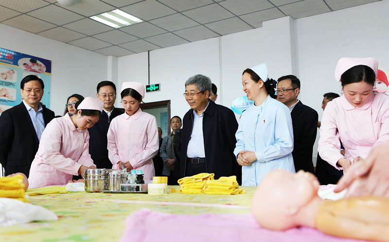 陈宝生部长一行在学校护理实训中心、药物制剂实训中心现场观摩了护理、药学实训教学,观看了急救护理、母婴护理、老年护理和仿真药物制剂实训过程后,他赞许道“这几个专业办得好”,并亲切地询问了正在备战全国护理技能竞赛的参赛选手训练情况,与现场师生互动交流。