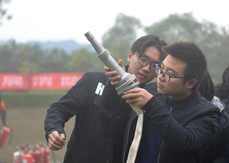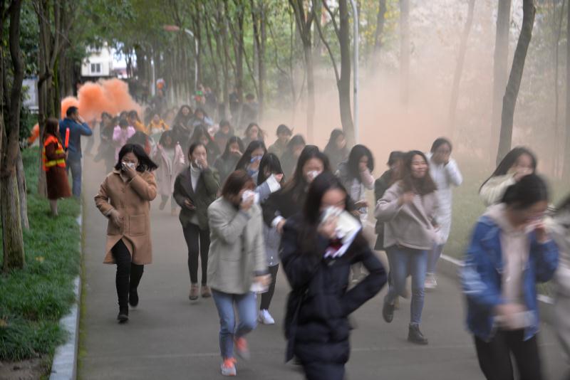 随后,由保卫处牵头,学生处、基建后勤处、护理学院等协办,在学生公寓5、7栋组织开展应急疏散演练(防火、防空、防地震、防暴恐)。下午4点,随着火情警报声,学生们在疏散引导员指引下,用毛巾捂住口鼻,低身弯腰,迅速有序穿过浓烟,向运动场指定区域集中,学校校卫队员迅速组织开展初期火灾扑救,学生消防志愿者参与现场维护和疏散引导,整个过程紧张有序,快速集中,经各班清点人数,两栋宿舍共计1650名学生,用时3分钟全部安全疏散到安全区域,没有出现安全事故和意外情况,达到了预期效果随后百安坝消防中队官兵赶往演练现场进行灭火扑救及人员搜救,整个应急疏散演练安全、有序、顺利完成。