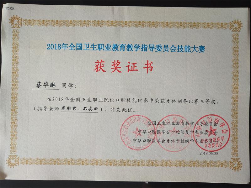 2018年6月30日,在开封大学举办的2018年日进杯全国卫生职业院校口腔技能大赛中,我校临床医学院口腔医学专业学生蔡华琳获得牙体制备组三等奖。自此,我校已连续三届在全国卫生职业院校口腔技能大赛中获得奖项。