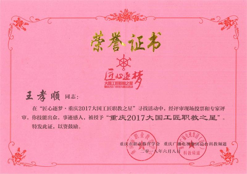 2018年6月8日下午,“匠心逐梦•重庆2017大国工匠职教之星”颁奖仪式在重庆市职教中心举行。本次职教之星寻找宣传活动,是由重庆职业教育学会,重庆电视台联合主办,从2017年5月至12月,历时8个月,从22个区县寻找选拔,入围100余人,最终评选出30名职教之星。学校医学技术系2015级医学检验技术专业学生王孝顺获得此项殊荣。