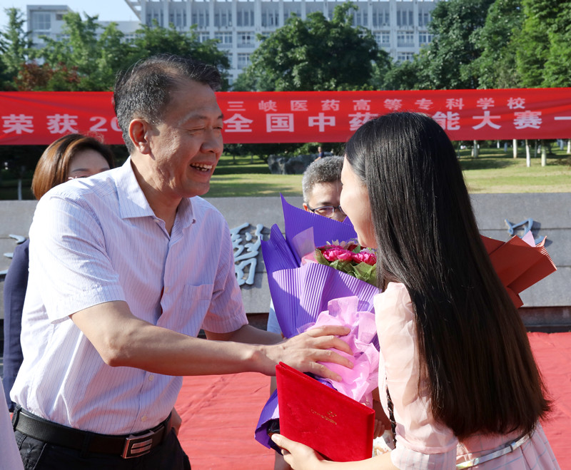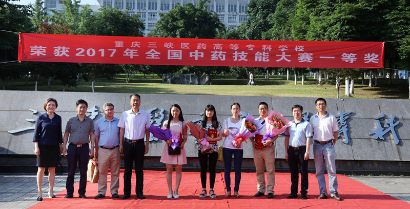 在日前结束的2017年全国职业院校中药技能大赛中我校再创佳绩。药学系选手张春、吴梅两位同学分别荣获高职组一、二等奖。6月7日上午8:10,获奖团队顺利归来,学校举行了隆重欢迎仪式迎接他们的凯旋。学校党委书记周建军、教务处处长沈力、药学系党政负责人及全体教职员工和400余名中药专业学生参加了欢迎仪式。
