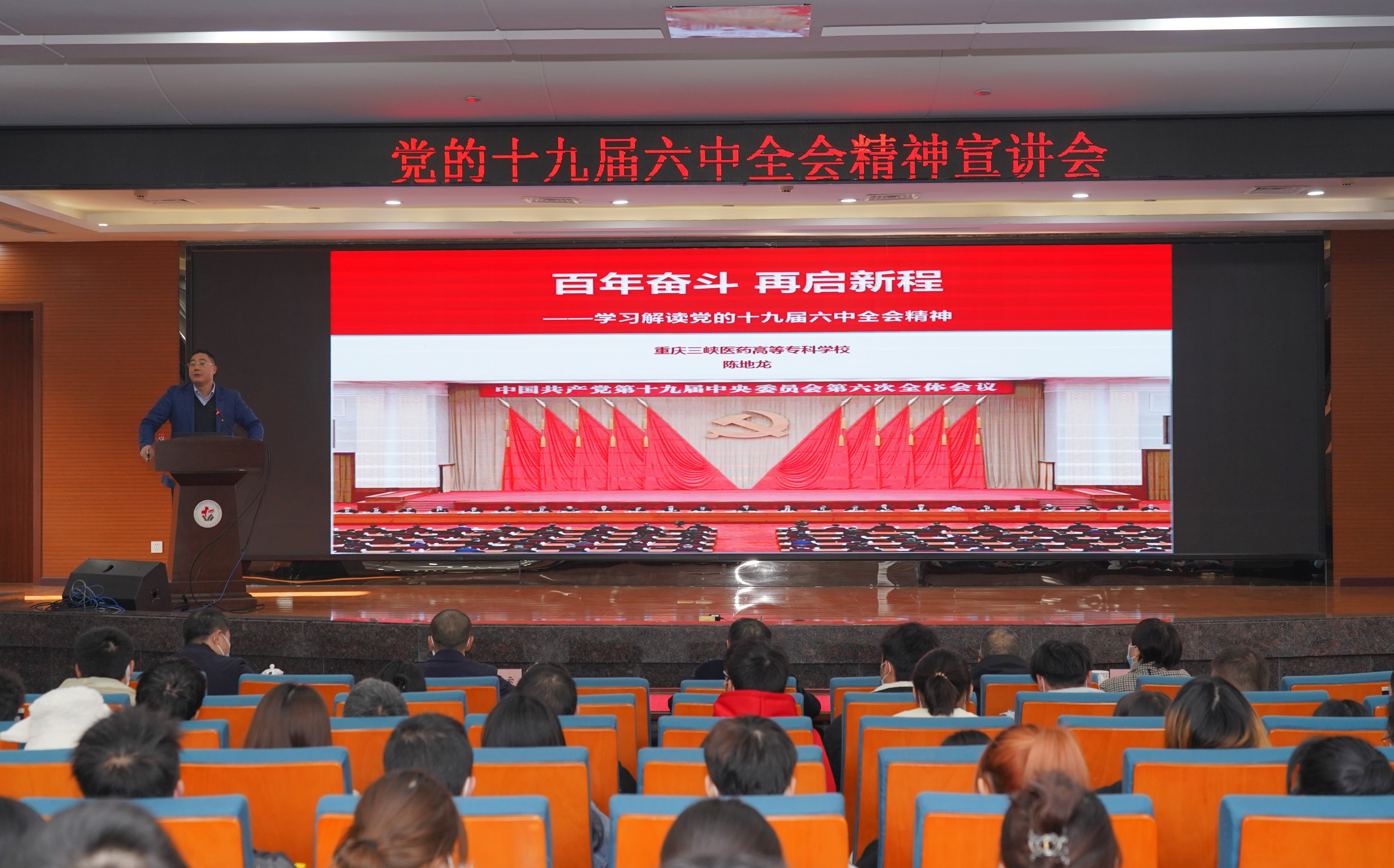 12月21日下午,学校党委副书记、校长陈地龙赴整合后的附属人民医院开展党的十九届六中全会精神专题宣讲,医院班子成员、中层管理人员、全体党员以及教学基地学生代表共300余人参加宣讲报告会,医院党委书记赖登祥主持宣讲会。
