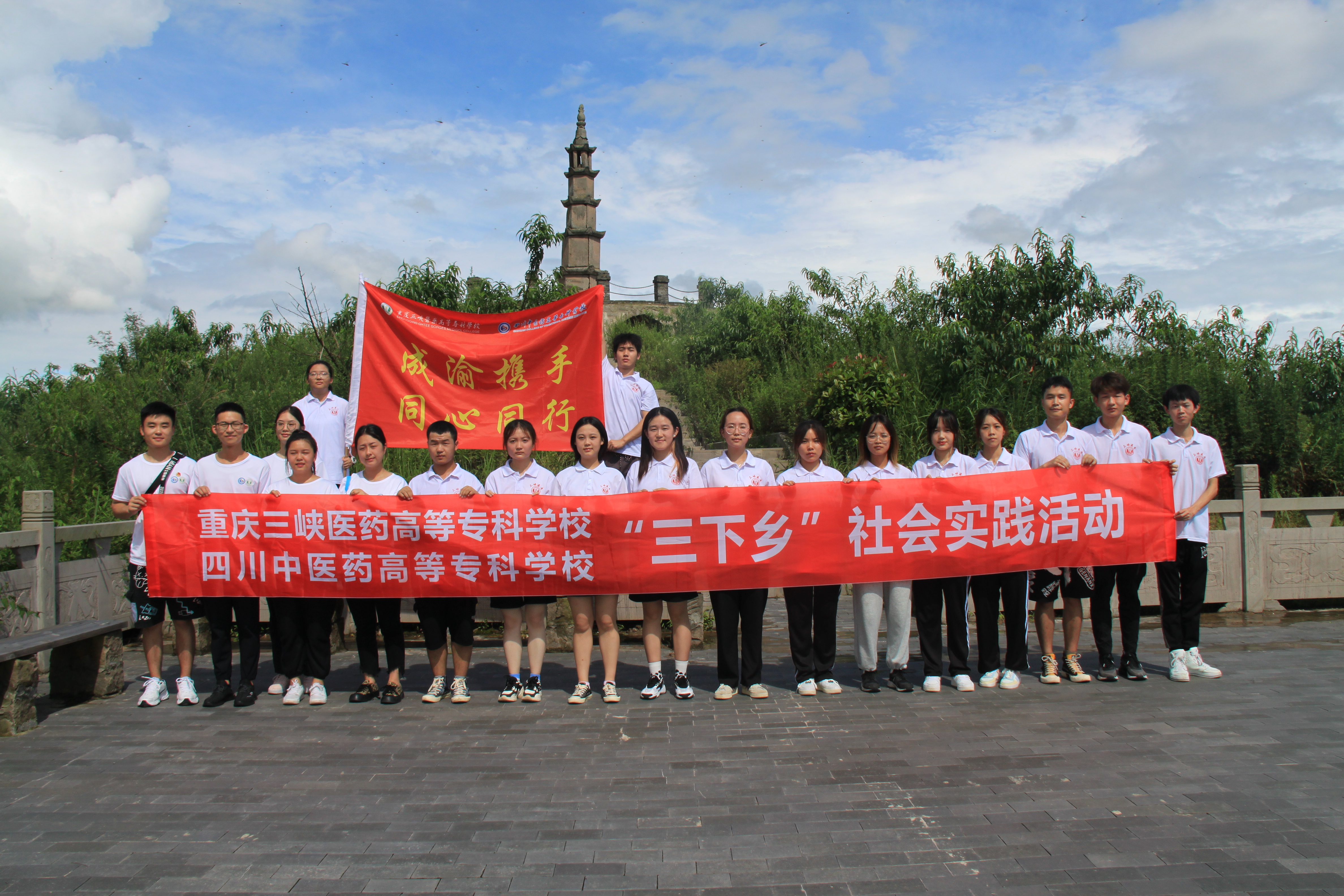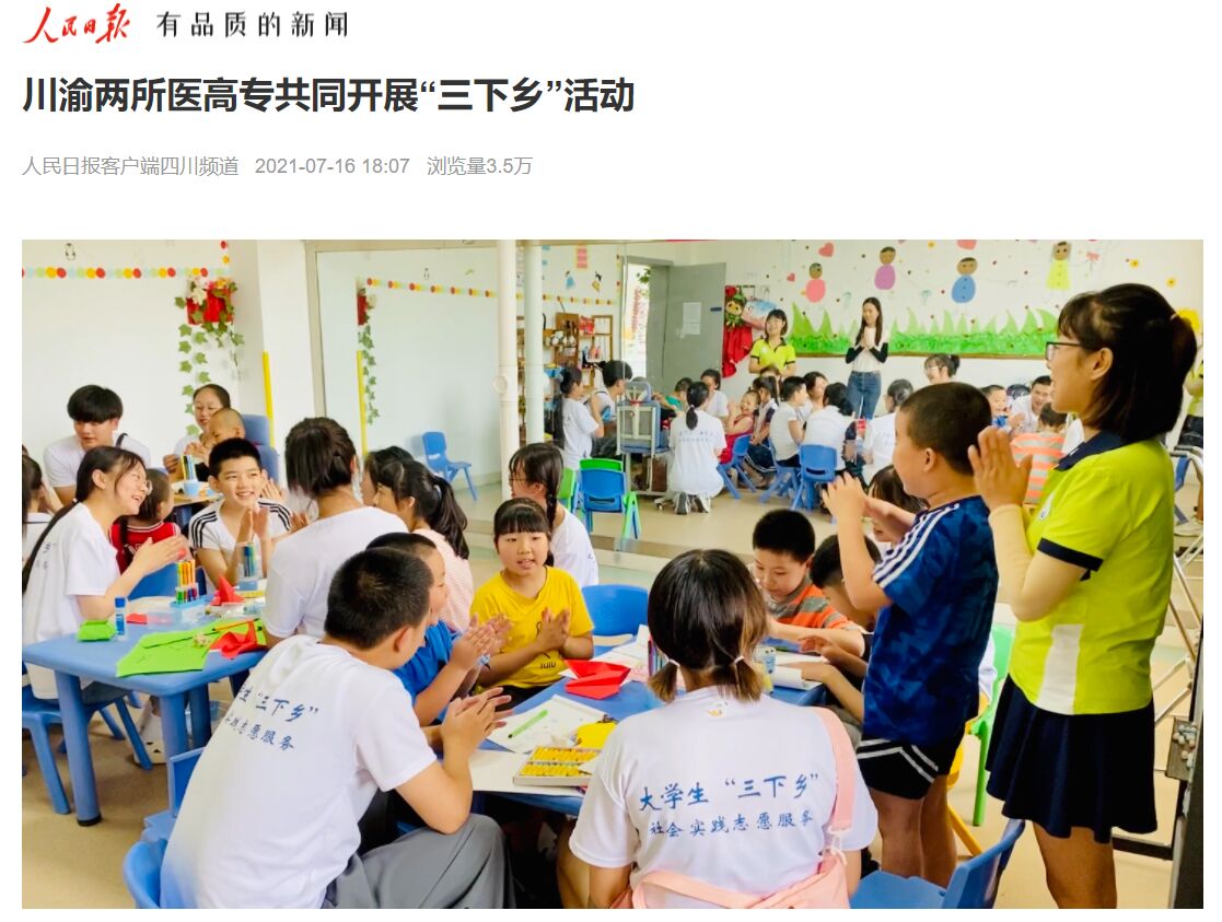 依托重庆三峡医药高等专科学校和四川中医药高等专科学校共同发起成立的“成渝双城经济圈卫生职业教育联盟”,双方互派团队到四川绵阳、重庆万州开展暑期“三下乡”社会实践活动。两校团委、医学技术学院团总支师生32人共同组建“成渝同行 土家结情”暑期社会实践队,于2021年7月前往万州区恒合土家族乡石坪村,以促进民族团结为主题开展了为期一周的“送医”“送技”“送文化”行动,取得良好效果,先后被上游新闻、重庆日报、中国青年网等报道,人民日报客户端以《川渝两所医高专共同开展“三下乡”活动》为题报道。
