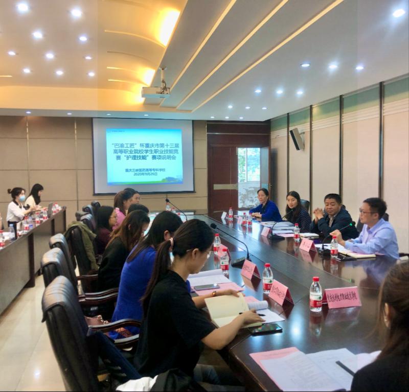 “巴渝工匠”杯第十三届“护理技能”大赛将由我校承办,按照市赛办统筹安排,2020年9月26日,在我校行政楼318会议室召开了赛项说明会,重庆市教委高教处一级调研员闵权、市赛办邓爽老师、学校教务处、护理学院负责人及相关工作人员共15人、重庆医药高等专科学校等10所院校的领队及指导老师出席本次会议,本次会议由学校教务处李小山处长主持。