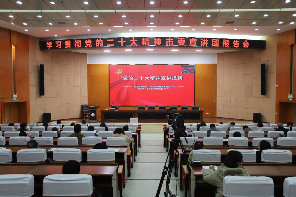 1月9日上午,学校在学术中心国际会议厅举行了党的二十大精神市委宣讲团到校宣讲会暨学校一月党委理论学习中心组(扩大)学习会议。本次宣讲会邀请学习贯彻党的二十大精神宣讲团成员、市委宣传部理论处处长徐久清同志作宣讲报告。学校党委副书记、校长陈地龙主持会议。宣讲会采取了线上+线下相结合的方式,共计2000余人参会。