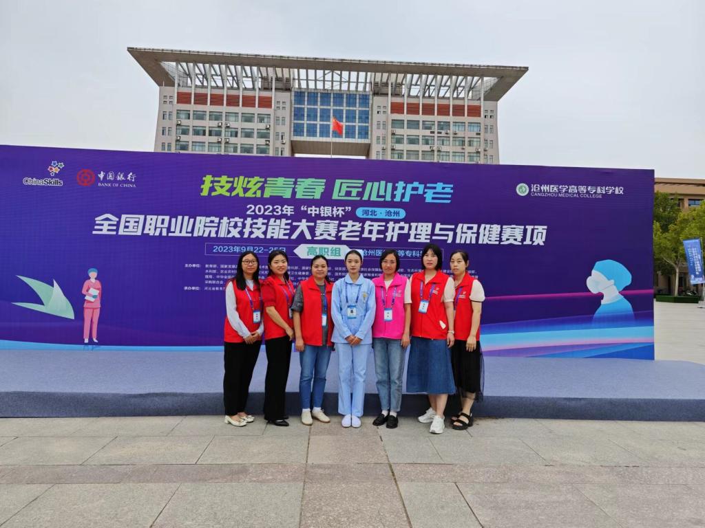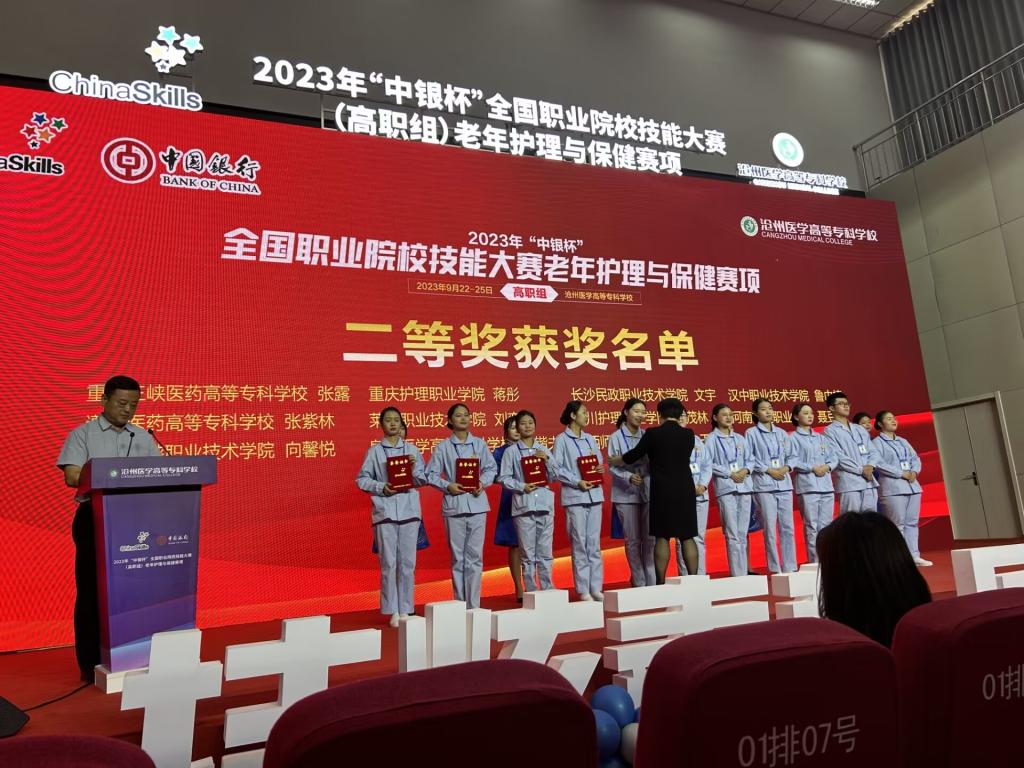 9月25日,由教育部等36家部委和事业组织联合主办,河北省教育厅、沧州市人民政府承办,沧州医学高等专科学校协办的2023年“中银杯”全国职业院校技能大赛(高职组)老年护理与保健赛项顺利闭幕。来自安徽、福建、内蒙古等全国各地的54名选手同台竞技,一较高下。护理学院副院长李为华带队参赛,经过激烈角逐,我校2021级老年保健与管理专业张露同学荣获二等奖。