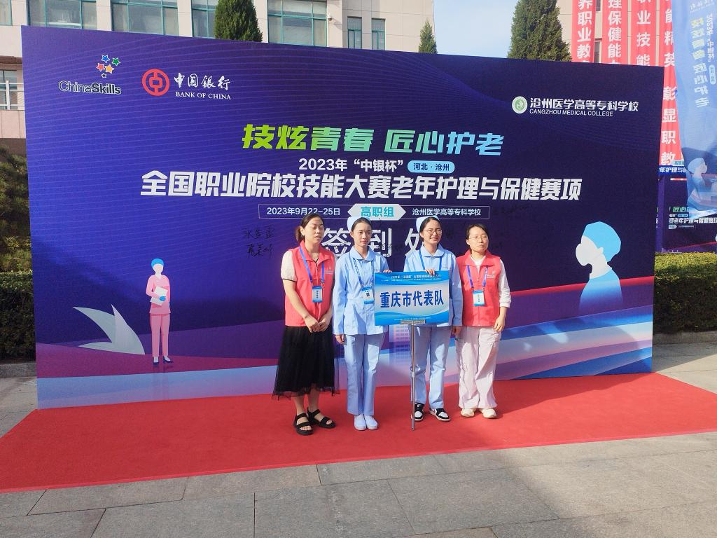 本次竞赛以促进老年人健康为宗旨,创新性地融合老年护理、康复保健、健康管理、营养指导等内容,依据国家“居家为基础、社区为依托、机构为补充”的养老方式改革,根据工作特点,设置社区居家、医养机构两个工作场景,每个工作场景包含老年人基础护理、慢病护理、康复服务和健康保健四个模块,从而全面考查学生基于典型工作任务的核心技能、职业素养等职业胜任能力。学校及学院领导高度重视此次比赛,给予各项支持与保障;赛前,指导团队老师带领学生反复强化理论知识,筑牢竞赛之基;深入养老机构实践一线,体验为老服务的人文之美;打造高仿真竞赛环境,共同研读竞赛标准,组织多场模拟赛以反复打磨细节,提升竞赛综合实力。竞赛过程中,参赛学生克服重重困难,顽强拼搏,展示出青春养老人良好的精神风貌,为重庆代表队取得荣誉。