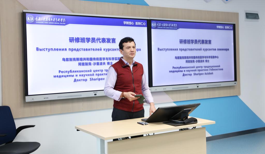 乌兹别克斯坦学员沙里波夫博士作为培训代表发言。他向学校致以最诚挚的敬意和感谢,表示这一个月来课程安排质量高,学员收获多,坚信本次研修班对学员们后续的工作和学习会有很大的帮助,学员们将以此为新的起点,不断努力,为传统医学的发展做出自己的贡献。