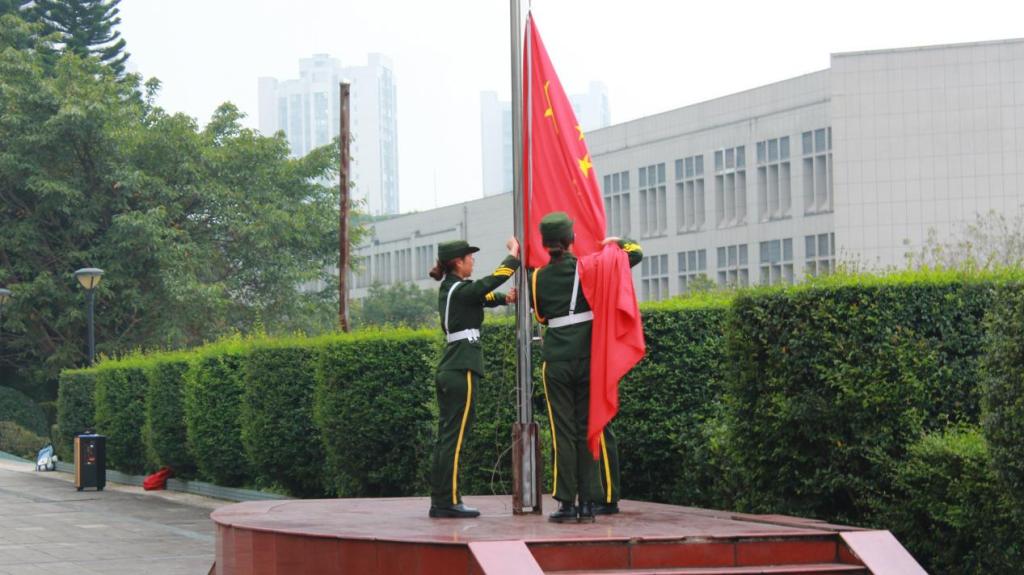 上午八点,伴随一声响亮的“出旗”口号,国旗护卫队队员们护着鲜红的国旗,迈着铿锵有力、整齐划一的步伐走向主席台,气氛庄严肃穆。伴随着《义勇军进行曲》,全场师生行注目礼,面向国旗高唱国歌。