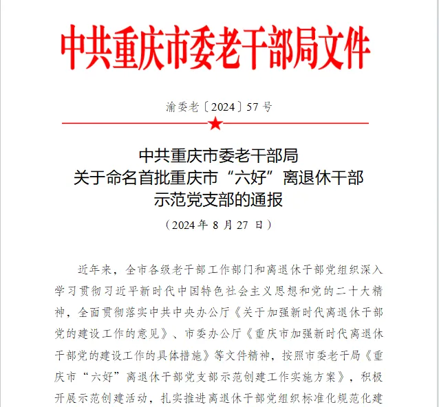 近日,我校离退休第一党支部被中共重庆市委老干部局评为首批重庆市“六好”党支部。离退休第一党支部围绕市委老干部局提出的组织设置好、班子建设好、党员队伍好、学习活动好、作用发挥好、制度坚持好等“六好”标准,坚持“退休不褪色、离岗不离心”,通过实施“三领三示范”党建工程,全面提升工作水平。