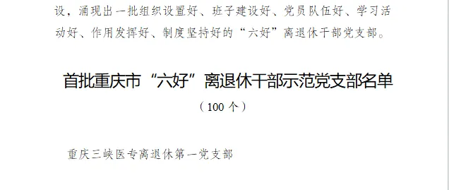 重庆三峡医药高等专科学校离退休第一党支部始建于2004年,2016年10月重组重建,现有党员14人,其中离休老党员3名、副处级以上领导干部党员11名。该党支部深入学习贯彻习近平总书记关于做好离退休干部工作重要论述,按照 “六好”标准,坚持“退休不褪色、离岗不离心”,通过实施“三领三示范”党建工程,全面提升工作水平。近年来,该党支部被教育部关工委表彰1人,校党委表彰4人。