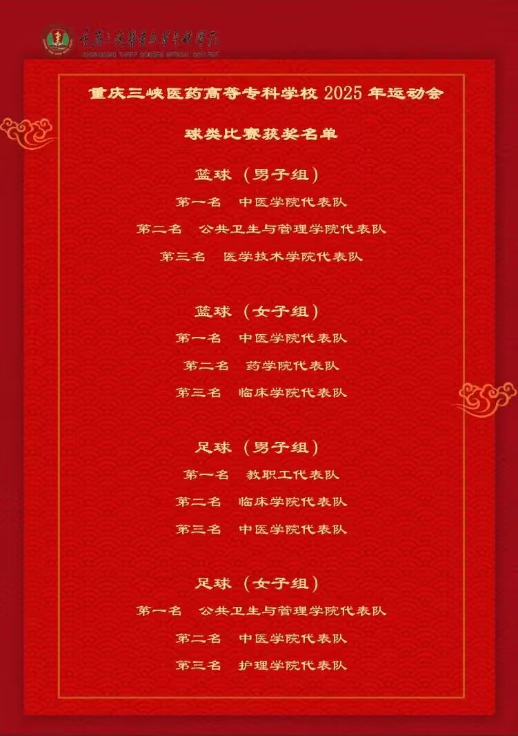 男子篮球项目中,中医学院凭借默契配合摘得桂冠,公共卫生与管理学院、医学技术学院分列第二、第三名;女子篮球赛场则呈现“巾帼不让须眉”之势,中医学院代表队荣获冠军,药学院、临床学院分获亚军、季军。