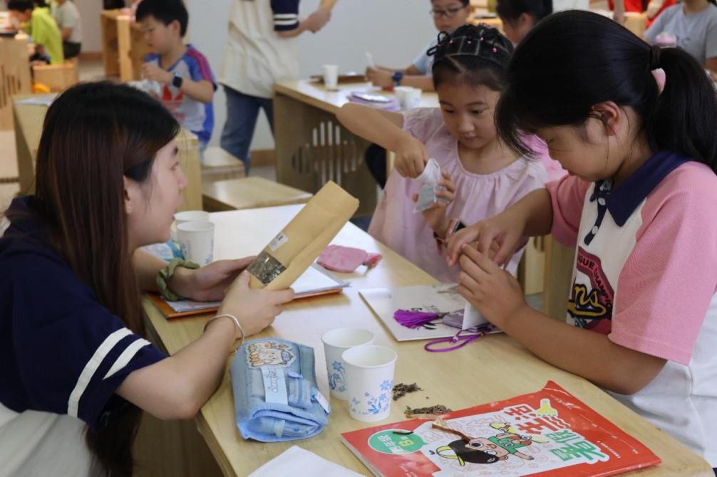在社区的托管班中,志愿者们积极地将自己所学的知识和技能转化为实际的教学输出,他们以“中医药+非遗”的文化轴线为核心,精心设计并开展了一堂既富有知识性又充满趣味性的文化体验课程。孩子们通过“看、闻、触、尝”等多种感官的综合运用,近距离地接触和感受了各种中药材的独特魅力。与此同时,在木版年画的制作课堂上,更是将当下流行的国潮IP“魔童哪吒”与木版年画进行了巧妙地融合与创新。当孩子们亲手制作出一个个寓意防疫保健的香囊,以及一幅幅充满创意的年画作品,并高举这些成果欢呼雀跃时,文化传承的种子已经在他们幼小的心灵中悄然播撒,生根发芽。