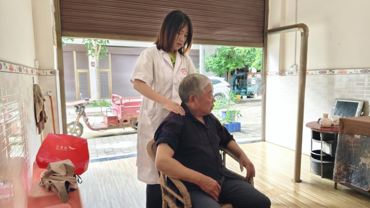 志愿实践团队的关爱之情不止于孩童,更将温暖延伸至周边中老年人。2025年7月3日,针对行动不便的老年人,志愿者携带专业设备提供贴心的上门服务,使用医用电子血压计为居民测量血压,记录数据并建立健康档案,对血压异常者进行初步评估与健康指导。解答居民关于高血压、糖尿病等慢性病的预防、用药及日常饮食注意事项。并且进行基础的保健按摩,让不便出门的老人们在家门口也能感受到社会的关怀与健康的守护。