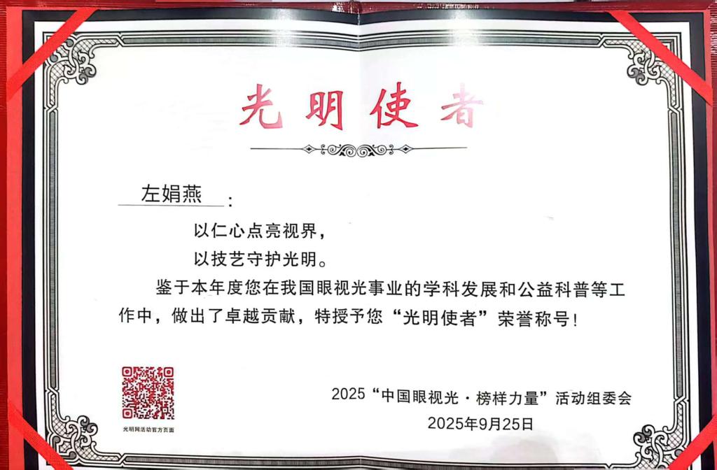 近日,首届“中国眼视光·榜样力量”主题展示活动传来喜讯,我校医学技术学院眼视光技术专业负责人左娟燕副教授,凭借其在专业教育、实践与行业服务领域的卓越贡献,成功获评“光明使者”荣誉称号。此次活动由海峡两岸多省市行业学会携手主办,在光明网官网及各眼视光学会、眼视光学术直通车等官方平台专题报道。