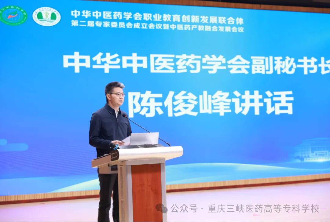 陈俊峰代表学会向联合体第二届专家委员会的成立表示祝贺。他介绍了学会的概况和学会在推进中医药人才队伍建设方面所做的工作。他表示:联合体作为中医药职业教育的平台和纽带,已逐渐形成由职业院校和医疗、科研及社会机构组成的中医药职业教育集群,成为建设高水平中医药职业教育体系的蓬勃力量。他对联合体第二届专家委员会工作提出三点工作建议:一是深入学习党的二十届四中全会精神,坚持党建引领,将全会关于教育、医药卫生、科技人才等战略部署落实到中医药职业教育实践中;二是围绕全国中医药职业教育创新发展目标,做好顶层设计,整合资源深化合作,破解制约发展的共性关键难题,提升服务经济社会发展的能力;三是聚焦重点任务,优化组织架构与工作机制,深化人才培养模式改革、专业内涵建设及产教融合,强化科技赋能创新,力争形成标志性成果。