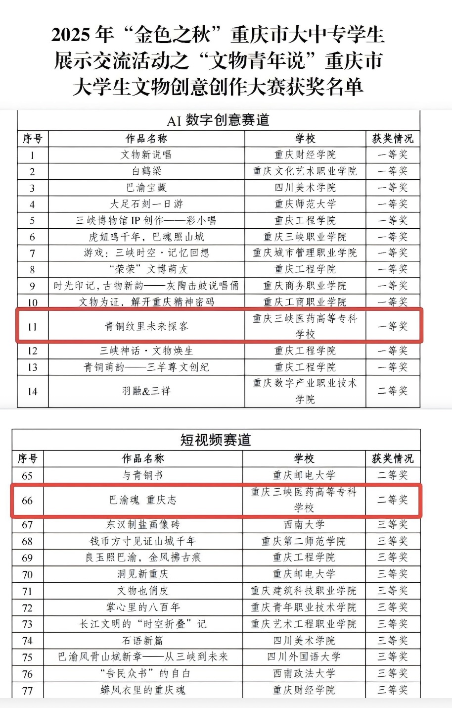 本次大赛汇聚重庆市48所高校的851件参赛作品,涵盖短视频、动画、AI数字创意三大赛道,其中37%的作品运用了3D修复、元宇宙展陈等前沿技术,充分彰显青年学子对文化遗产保护的创新思考。经初赛选拔,219支团队进入决赛,临床医学院学生作品《青铜纹里未来探客》荣获AI数字创意赛道一等奖,医学技术学院学生作品《巴渝魂 重庆志》获短视频赛道二等奖,展现了我校学子在文化传承与数字技术创新领域的突出实力。