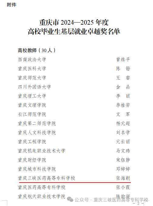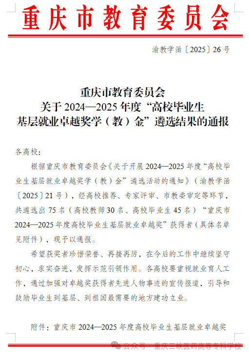 近日,重庆市教育委员会正式公布了2024-2025年度高校毕业生基层就业卓越奖获奖名单。我校临床医学院辅导员张海朝与2017届公共卫生管理专业毕业生余霞双双上榜。这一荣誉不仅是对获奖师生个人的高度认可,更是我校长期以来服务地方发展、引导毕业生扎根基层建功立业育人实效的集中体现。