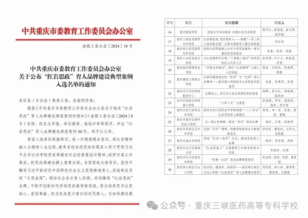 我校刘长旭副教授申报的《红岩铸医魂 思政育新人——构建“一导二师三保四度五维”立体式课程育人模式的探索》成功入选全市“红岩思政”育人品牌建设典型案例。