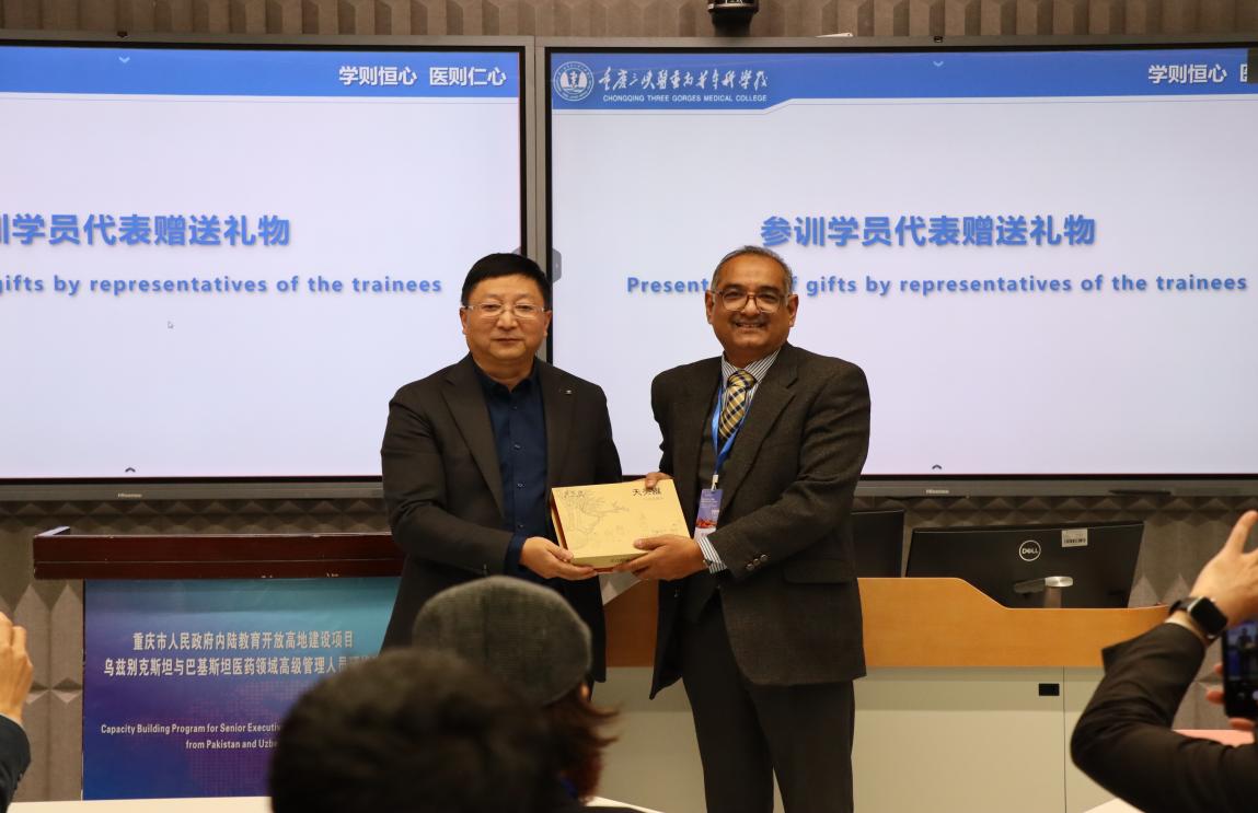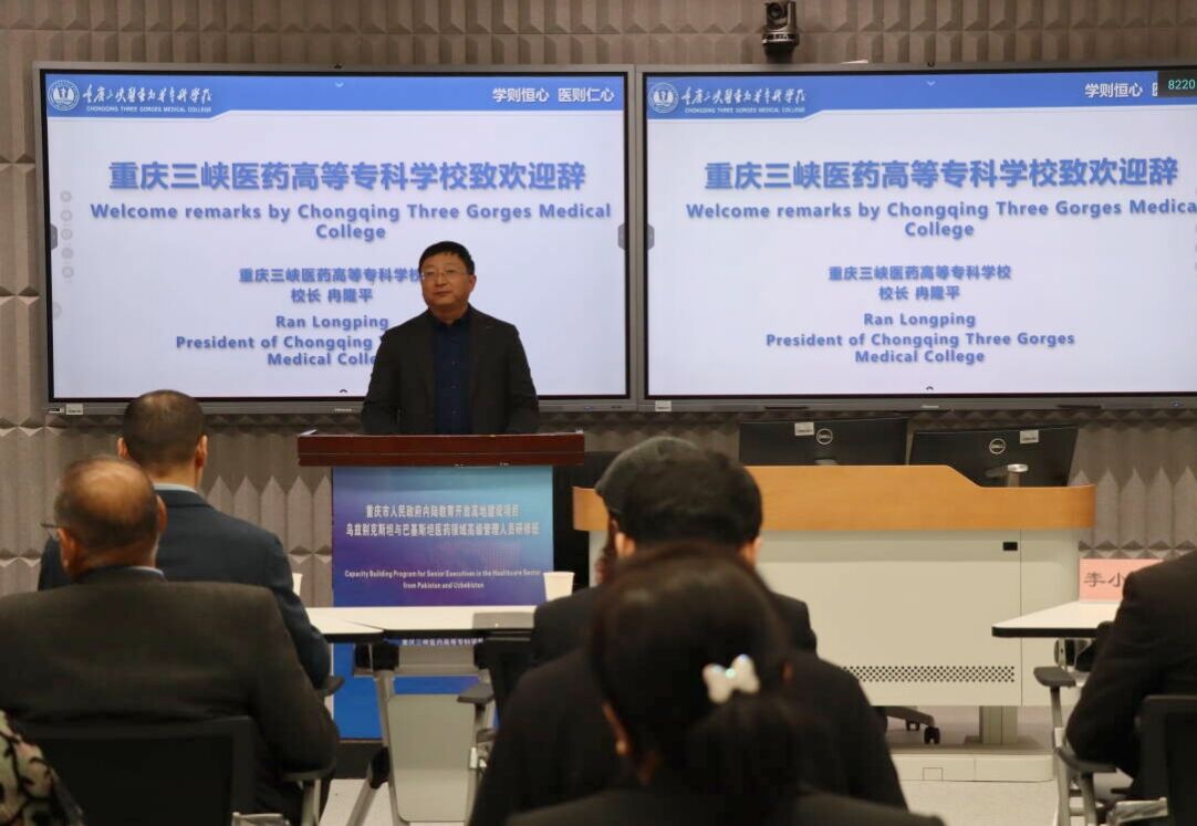 12月9日下午,“乌兹别克斯坦与巴基斯坦医学领域高级管理人员研修班”在重庆三峡医药高等专科学校第二教学楼101教室举行了开班仪式。学校党委副书记、校长冉隆平,学校党委委员、副校长李小山,发展规划处、医学技术学院、药学院负责人及相关教师,乌兹别克斯坦16名学员、巴基斯坦11名学员共同参加。开班仪式由李小山主持。