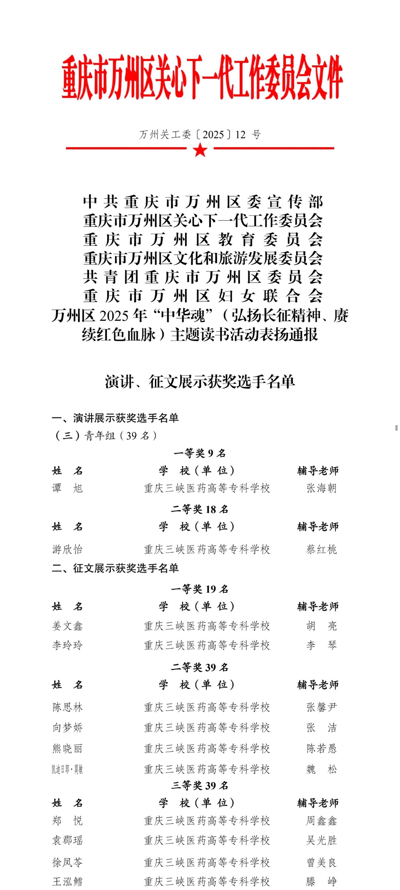 近日,万州区关心下一代工作委员会等六部门联合发布《关于2025年“中华魂”(弘扬长征精神、赓续红色血脉)主题读书活动表扬通报》(万州关工委〔2025〕12号)。在此次活动中,我校积极参与、精心组织,选送作品在征文与演讲比赛中表现优异,共荣获演讲比赛一等奖1项、二等奖1项;征文比赛一等奖2项、二等奖4项、三等奖4项,集中展现了我校青年学子传承红色基因、赓续精神血脉的良好精神风貌与扎实综合素养。