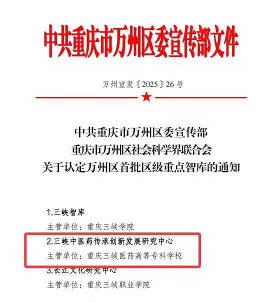 近日,我校“三峡中医药传承创新发展研究中心”成功获批为万州区首批重点智库。这标志着学校在区域中医药领域的长期深耕与突出贡献,获得地方政府高度认可。
