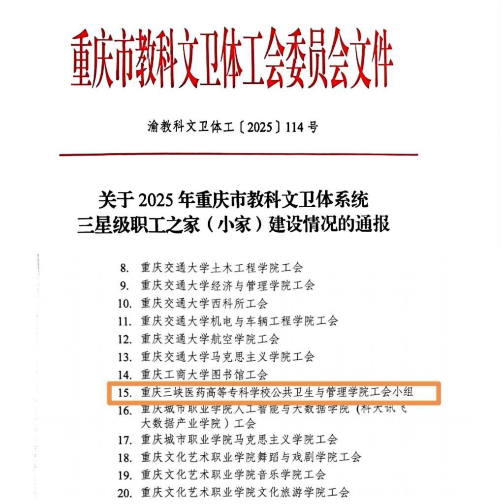 近日,公共卫生与管理学院工会小组成功获评重庆市教科文卫体系统三星级“职工小家”称号,成为全市29个获此殊荣的集体之一。