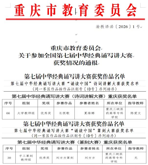 近日,教育部公布了第七届中华经典诵写讲大赛获奖名单,我校推报的诗词讲解类作品《长恨歌》与篆刻类作品《刘方方篆刻》脱颖而出,双双斩获国家级优秀奖,创我校历史最好成绩。