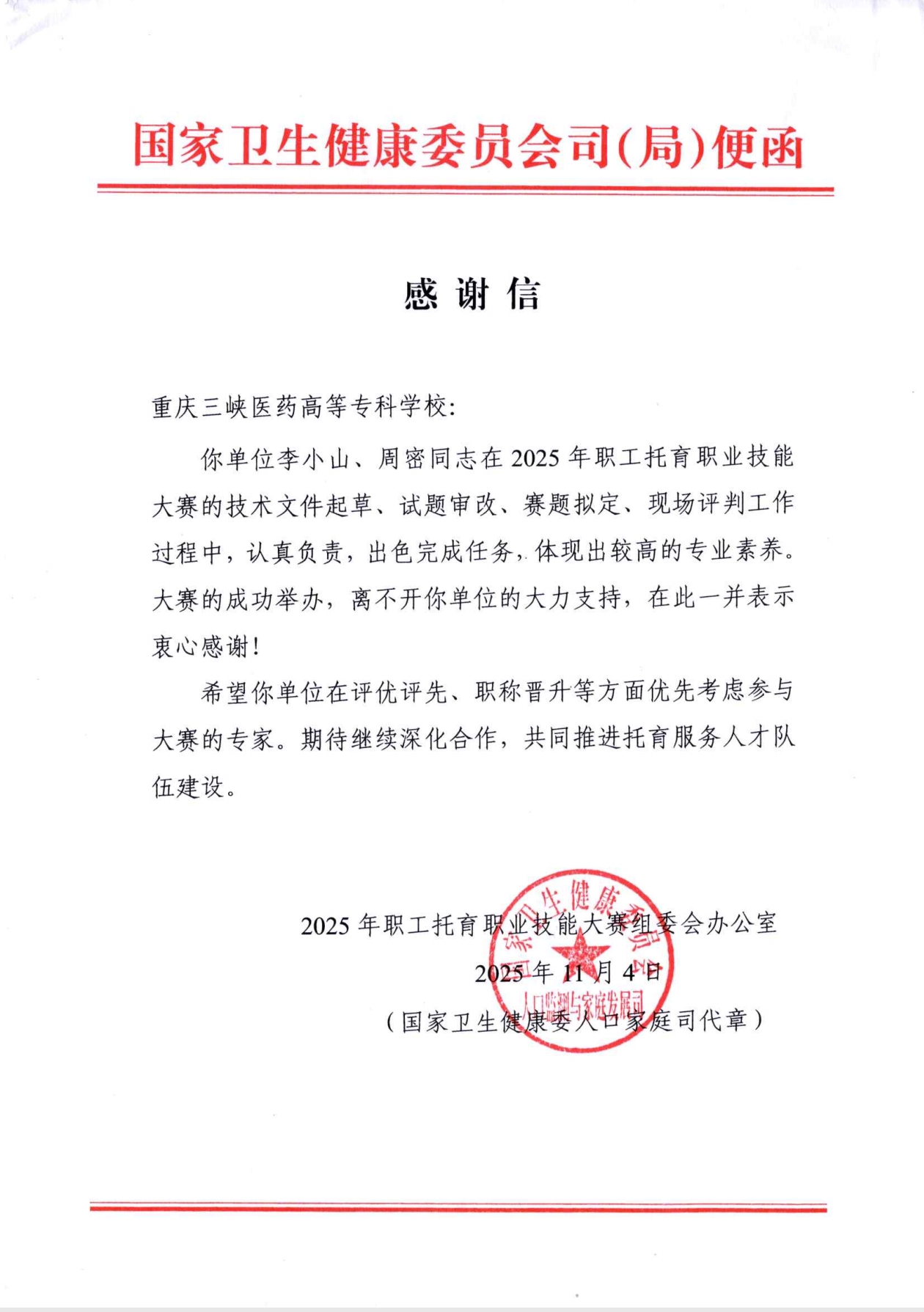 近日,我校收到国家卫生健康委员会发来的感谢信。信中对学校在全国总工会、国家卫生健康委、全国妇联与四川省人民政府联合主办的 2025 年职工托育职业技能大赛决赛中给予的大力支持致以诚挚谢意,特别表彰了我校受邀担任竞赛专家的李小山副校长、周密老师在技术文件起草、试题审核、赛题拟定及现场评判等关键工作中的卓越贡献,高度肯定了我校托育教师团队过硬的专业素养与强烈的责任担当。