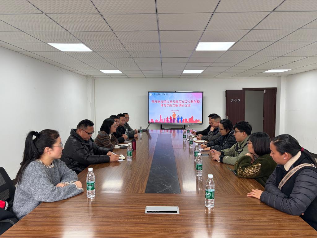 3月20日,重庆幼儿师范高等专科学校体育学院院务委员会副主任叶琼一行来到我校,在体育馆202会议室开展调研交流活动。公共基础部负责人李红丹及相关教师参加此次座谈会。