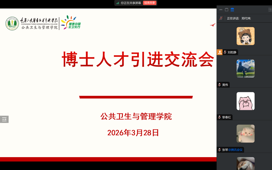 为优化人才队伍结构,强化学科建设实力,3月28日晚,公共卫生与管理学院召开博士人才引进线上交流会。本次会议邀请6名拟招聘的博士参会,公共卫生与管理学院直属党支部书记、副院长郑代坤,及学院博士教师代表参加了会议。