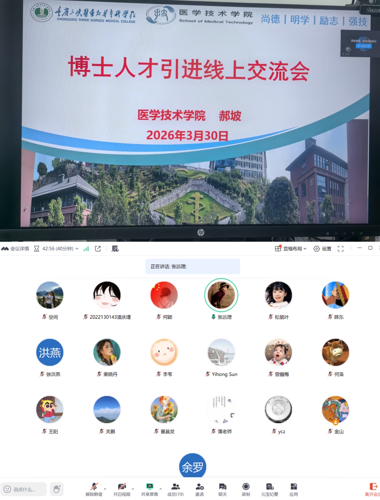 为深入实施人才强校战略,精准对接高层次人才需求,拓宽引才渠道,3月30日,医学技术学院召开博士人才引进线上交流会。本次会议邀请10名拟参加招聘的博士参会,医学技术学院院长郝坡,副院长蒲永莉,专职副书记张远理,及学院专业带头人、教研室主任参加了会议。