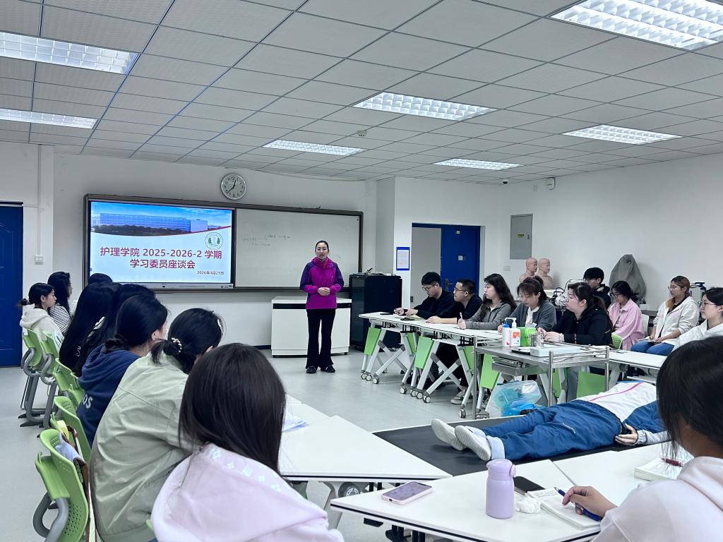 为深化教学沟通、提升育人质量,4 月 21 日,护理学院于 B5-414 召开 2025-2026 学年第二学期学习委员座谈会。学院副院长李为华、教务科副科长苏蔚、实训中心主任张利、教学干事丁时青、考务干事孙红珊、见习干事高淳及学院 50 个班级学习委员参会,会议由丁时青主持。