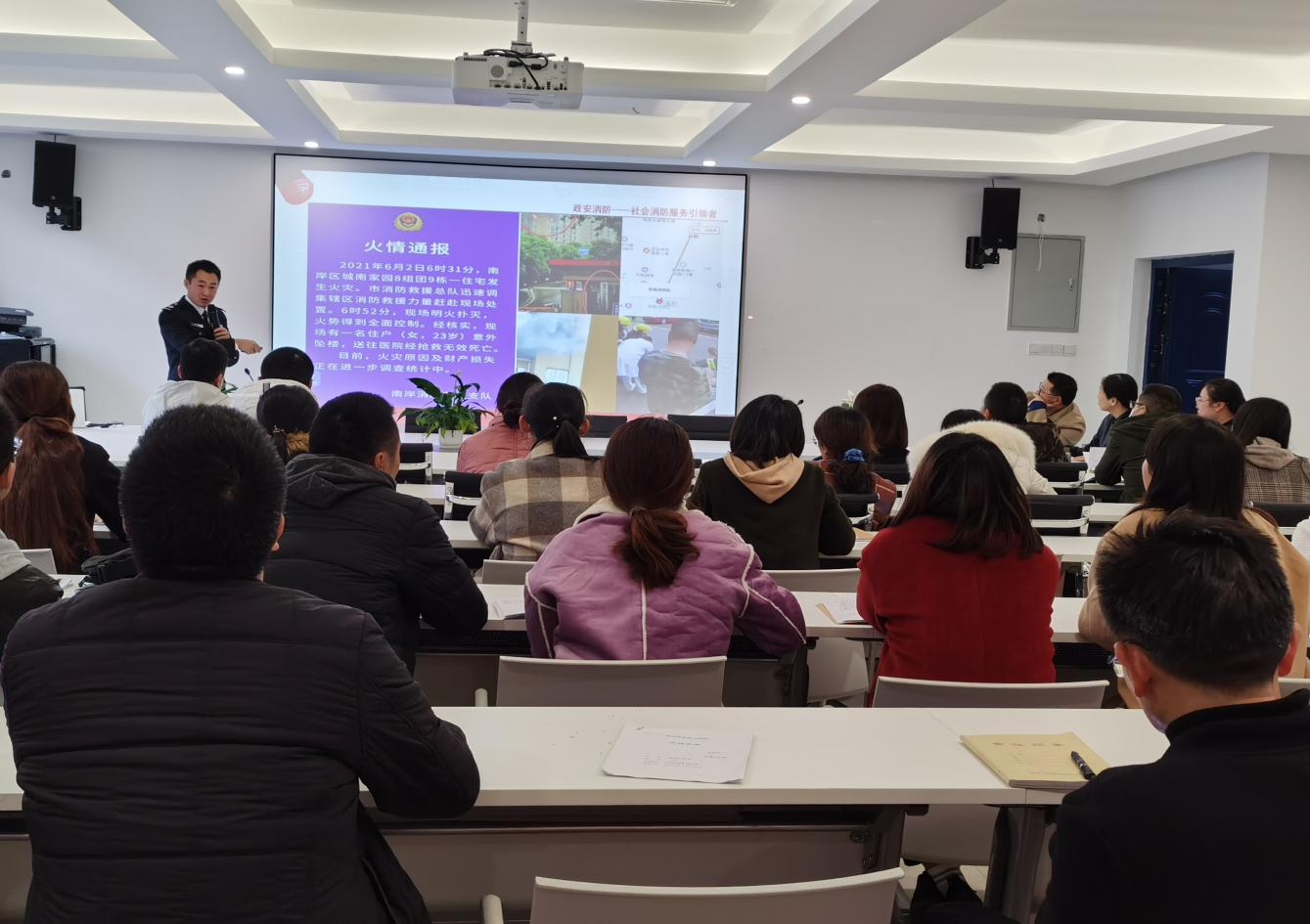 培训开始之前,学院书记罗玉琳、院长郝坡强调了安全工作无小事,务必抓紧抓好安全工作,希望大家能认真学习消防安全知识,不断提高安全意识,防患于未然。培训中,消防教官首先采用PPT和视频播放等教学方式,分析了近年来发生的多起重大火灾事故的原因,用触目惊心的画面使全体参训人员心灵受到了极大的震撼,深刻认识到了“隐患险于明火、防范胜于救灾”的重要性。接着讲解了如何开展消防隐患排查,同时还结合实际讲解了实训室火灾、厨房火灾、车辆事故等火灾的防火自救技巧。讲座培训结束后,教官带领参训人员下楼进行消防实际操作演练,教官边讲解边示范灭火器的正确使用方式,不仅使大家掌握了灭火操作要领,而且让大家对危急时刻的灭火和逃生步骤有了更深刻的体会。