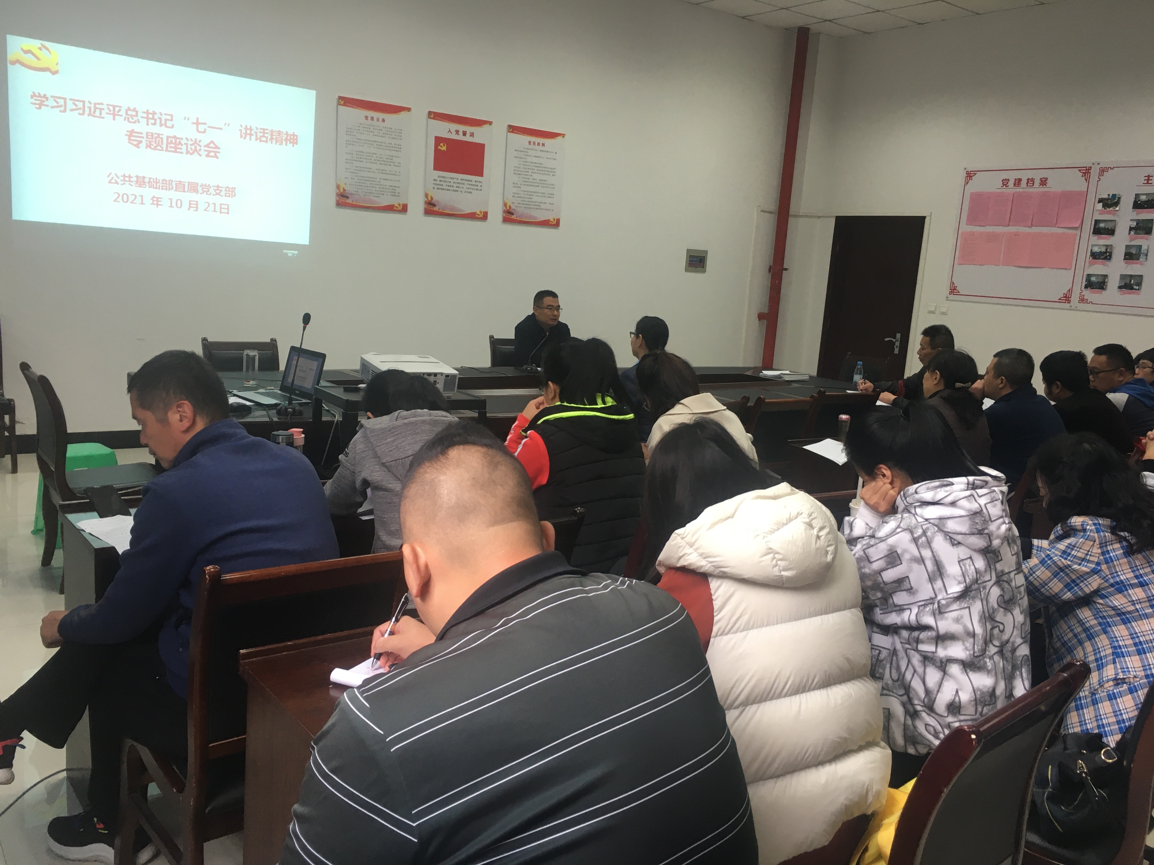 为了引导和推动党员干部学深悟透笃行习近平总书记“七一”重要讲话精神,扎实开展党史学习教育,公共基础部直属党支部于10月21日下午在学术中心209会议室开展了学习习近平总书记“七一”重要讲话精神专题座谈会。全体党员参加了座谈会,会议由支部书记王洪生同志主持。
