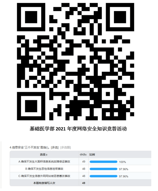 为了使全体教师进一步明确网络安全工作的重要性,懂得更多的网络安全防范知识和自我保护知识,基础医学部运用问卷星软件开展“2021基础医学部网络安全宣传周知识竞答活动”。通过知识竞答活动,以网络安全法及相关政策法规、网络安全基础知识、个人信息保护、网络安全防护技能等为内容,旨在通过知识竞赛,激发全体教师学习网络安全知识的积极性,提升网络安全意识和基本防护技能。