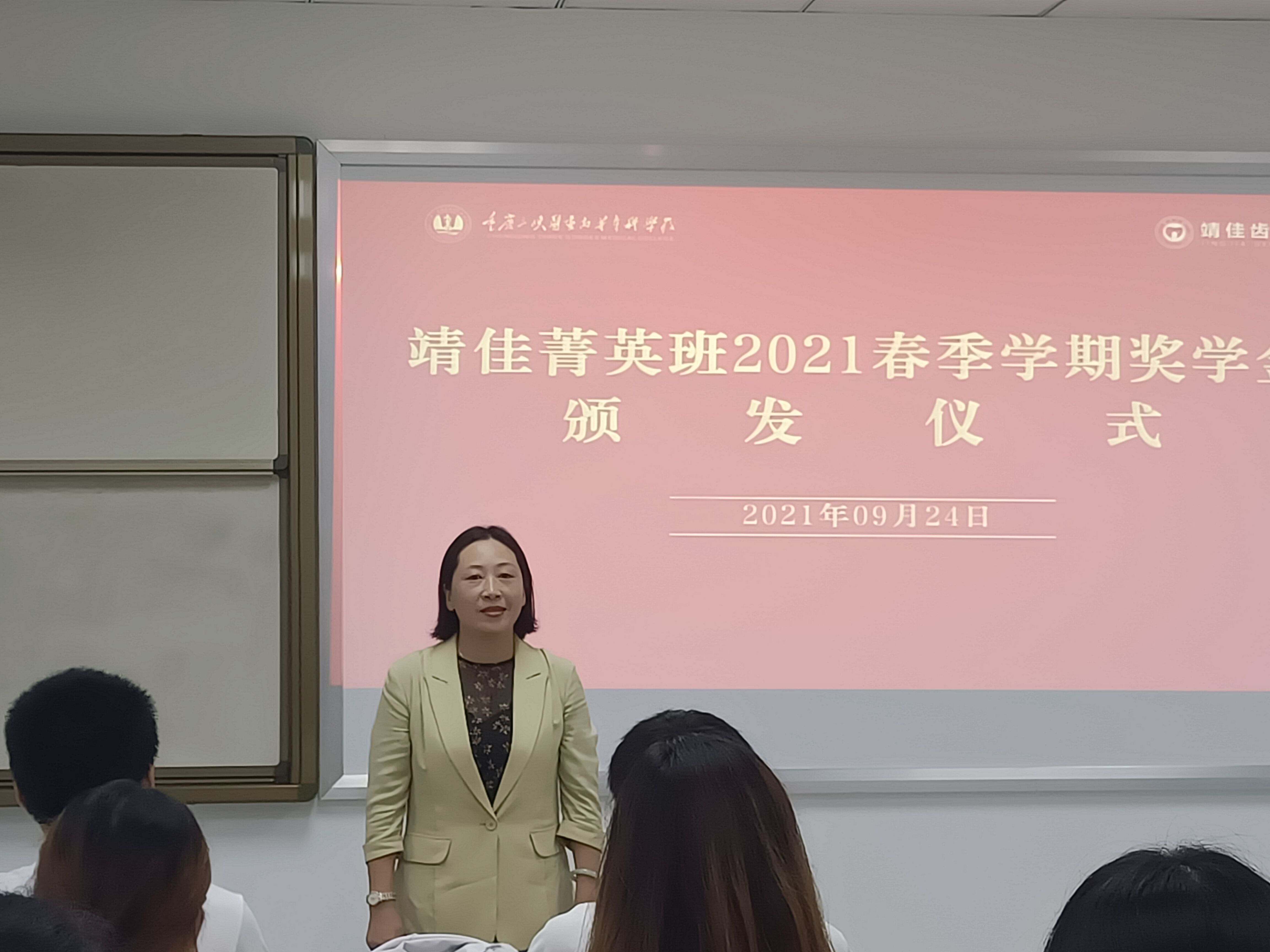 9月24日,医学技术学院与重庆靖佳齿科技术有限公司在B2实训楼联合举行“靖佳精英班”2021年春季学期奖学金颁发仪式。重庆靖佳齿科技术有限公司董事长石皓婷、部长梁怡,医学技术学院书记罗玉琳、口腔医学技术教研室老师和“靖佳班”全体学生参加。