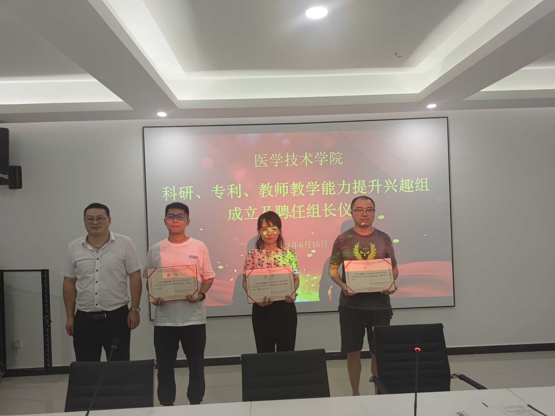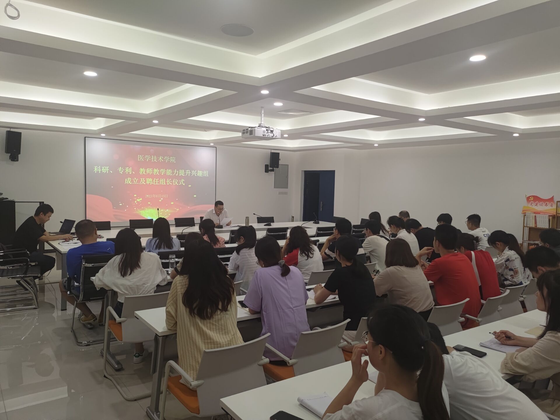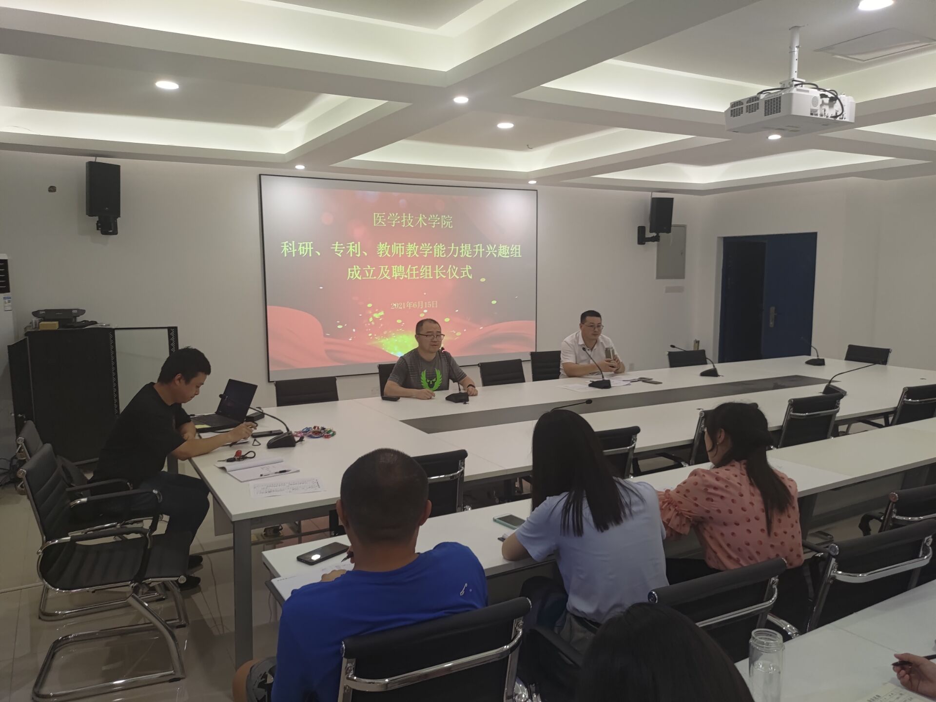 6月15日下午,医学技术学院在B6-415室举行科研、专利、教师教学能力提升兴趣组组长聘任仪式,共计38名专兼职教师参加。会议由教管办王静老师主持。