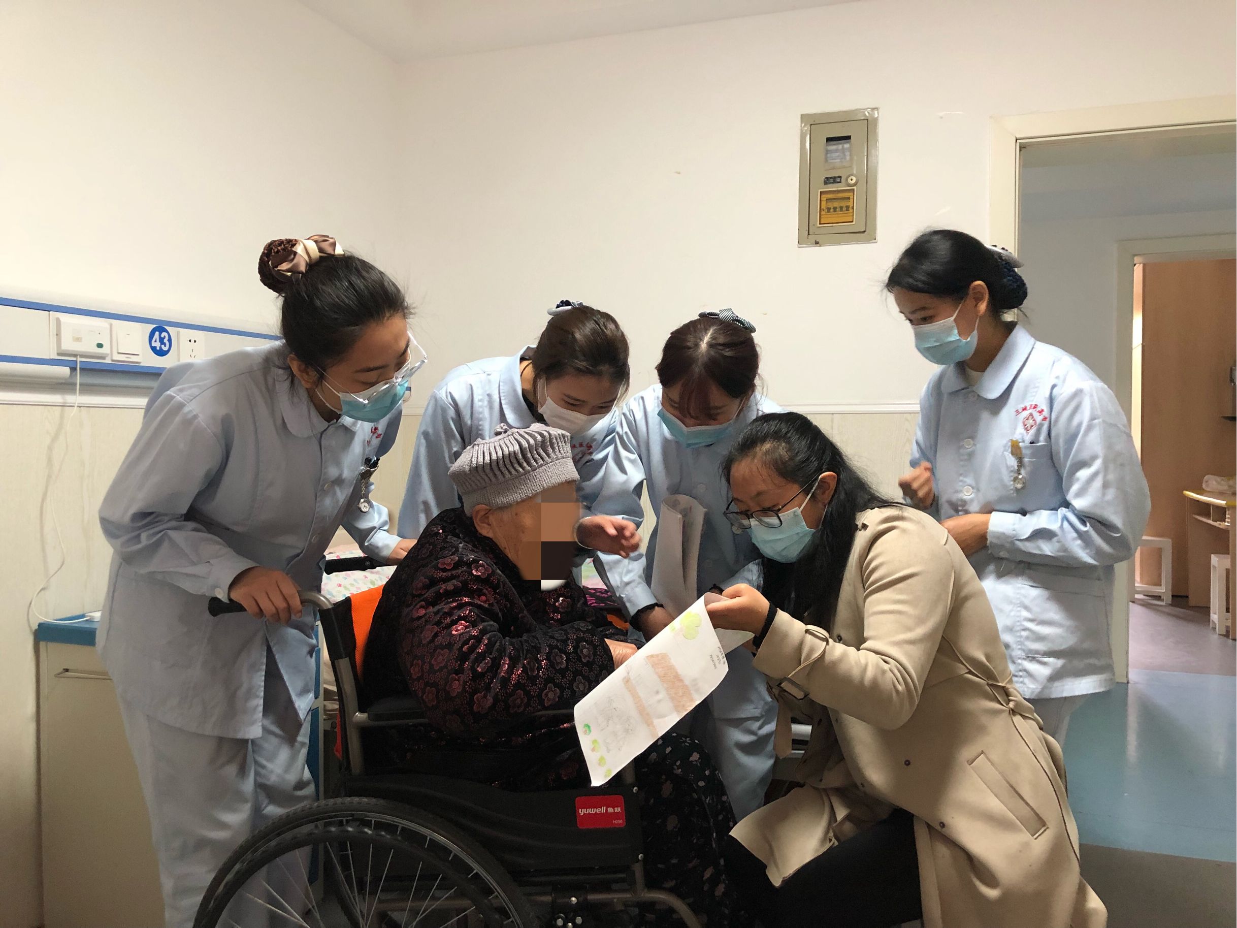 首先,同学们跟随福利院资深养老护理员,熟悉介护区工作环境与流程,观摩学习护理员给老人喂饭、翻身等技能操作,掌握了典型工作任务的知识点、技能点及素质要求。为保障老人安全,王卉根据1+X老年照护职业技能等级标准,向同学们及福利院新进养老护理员示教电子血压计测量血压、轮椅转运、认知功能训练、偏瘫老人康复训练等操作。随后两两一组,学以致用,同学们利用所学知识对老人开展实践活动,模仿专任老师和行业指导老师,实施操作时亲切地与老人交流,并进行慢性病健康宣教,老人们对同学们的学习能力高度赞赏。