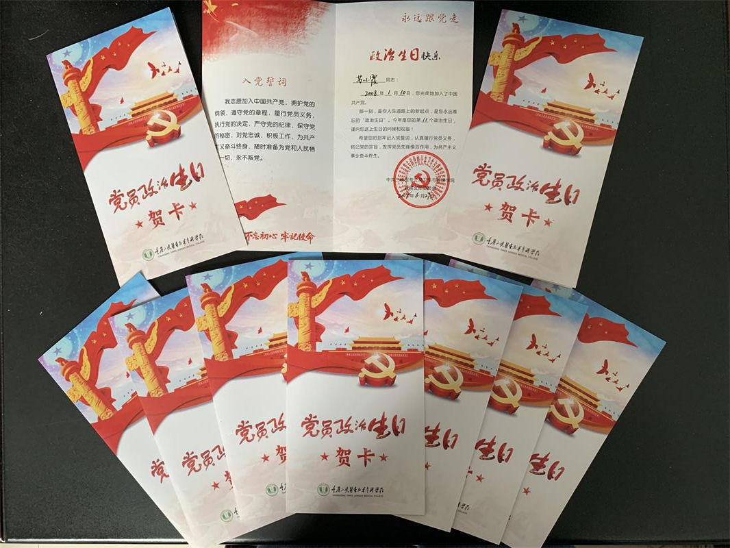 接着,袁定明同志、杨柳清同志为今年上半年过政治生日的10名党员同志送上了精美的政治生日贺卡。一张小小的贺卡,是对党员同志的激励,更是鞭策,提醒党员时刻牢记党员身份,时刻牢记党的宗旨和使命,发挥党员先锋模范作用。