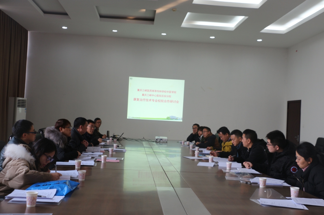 2019年1月17日下午,重庆三峡中心医院百安分院王义亮副院长一行20余人到中医学院就康复治疗技术专业开展校院合作进行研讨。中医学院苏绪林院长、董江峡书记、易志龙副院长,康复治疗技术教研室全体老师参加了会议。