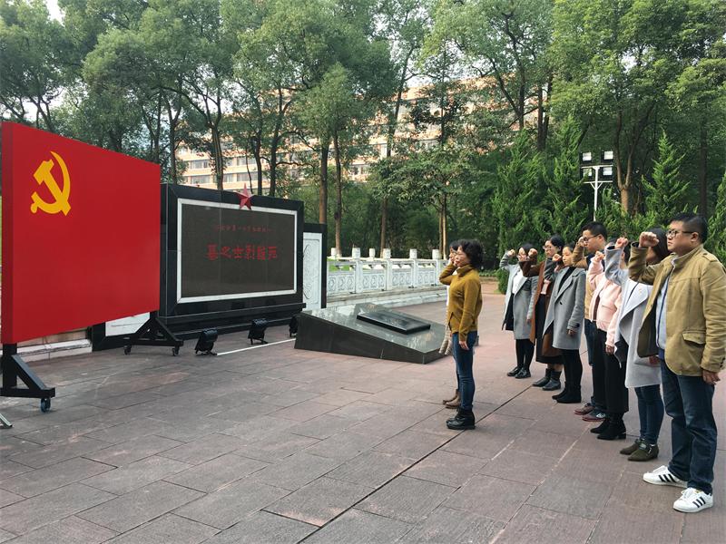 在松柏掩映的重庆歌乐山革命烈士陵园里,老师们怀着崇敬的心情向革命烈士鞠躬默哀致敬,表达对革命烈士的缅怀和哀思。全体党员面对鲜艳的党旗,举起右手,紧握拳头,在支部书记杨柳清同志的带领下重温入党誓词,唤醒和铭记当初入党时的初心,坚定信仰和使命,以革命先烈为楷模,做好本职工作,不忘初心,继续前行,永葆对党的感情和忠诚。