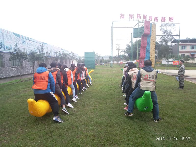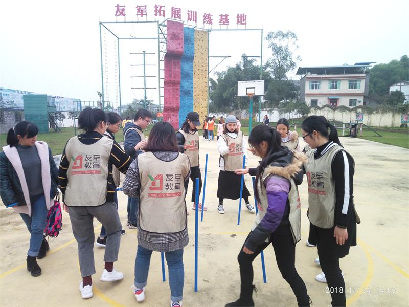 拓展训练在合川友军青少年综合实践科普教育基地举行。上午,开展的是一系列生活体验活动,导师和学生团结协作,一起推石磨磨豆浆,一起舂石舀打糍粑,一起摘蔬菜做柴火饭。在欢声笑语中既体验了“自己动手、丰衣足食”的成就感,也增进了师徒情谊和团队友谊。下午以团队合作活动为主,“不倒森林”“我们是最优秀的团队”“挑战极速60秒”“水到渠成”“毛毛虫大作战”等一个个既残酷、又好玩的项目,让师徒们的团队精神得到迸发,大家都不言放弃,越战越勇。每完成一个项目后,都要进行教官讲评、小队讨论、集体总结,使体验凝练成经验、经验升华为理念,全体师生都顺利通过了“团队精神”这重要的一课。